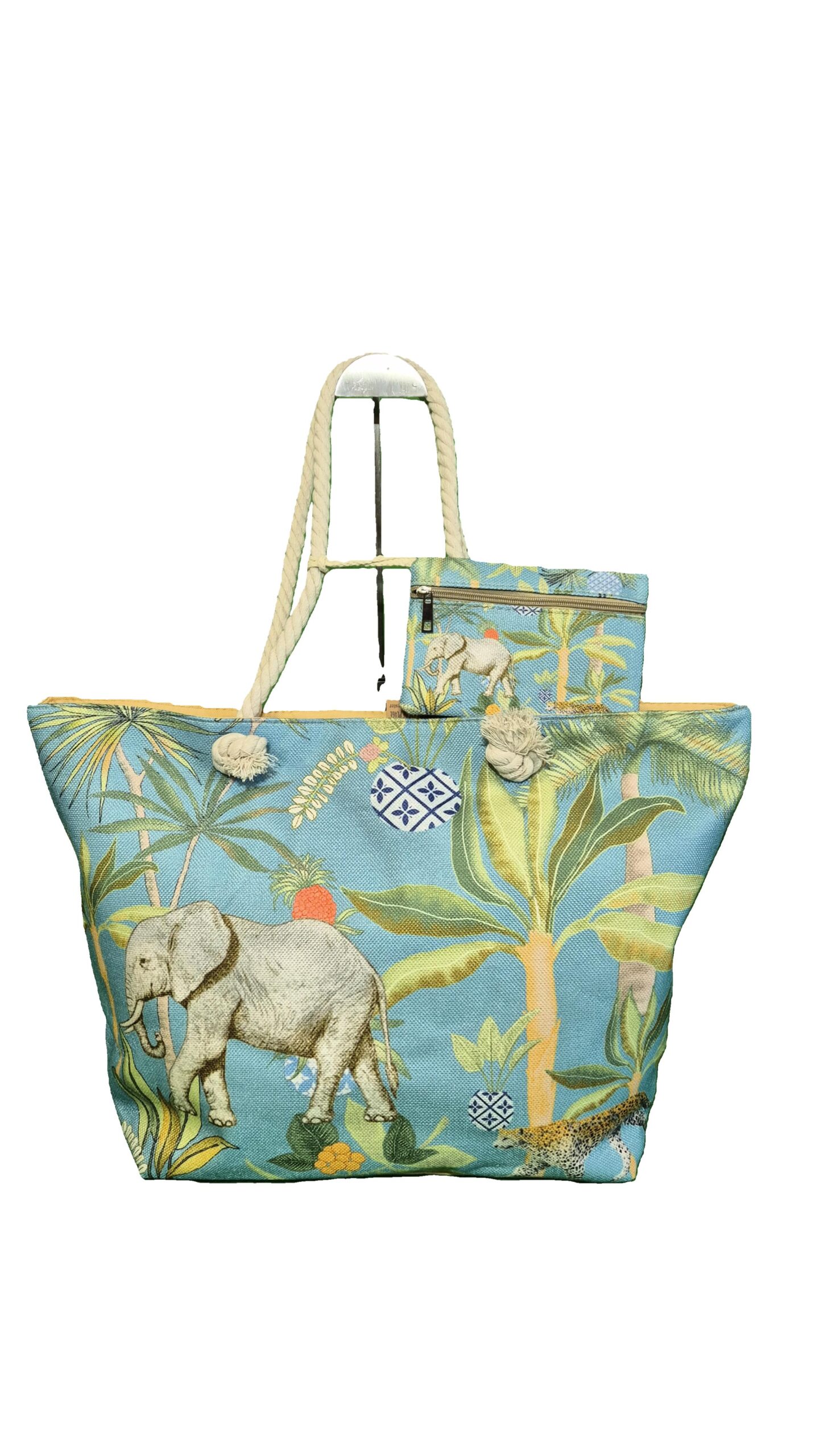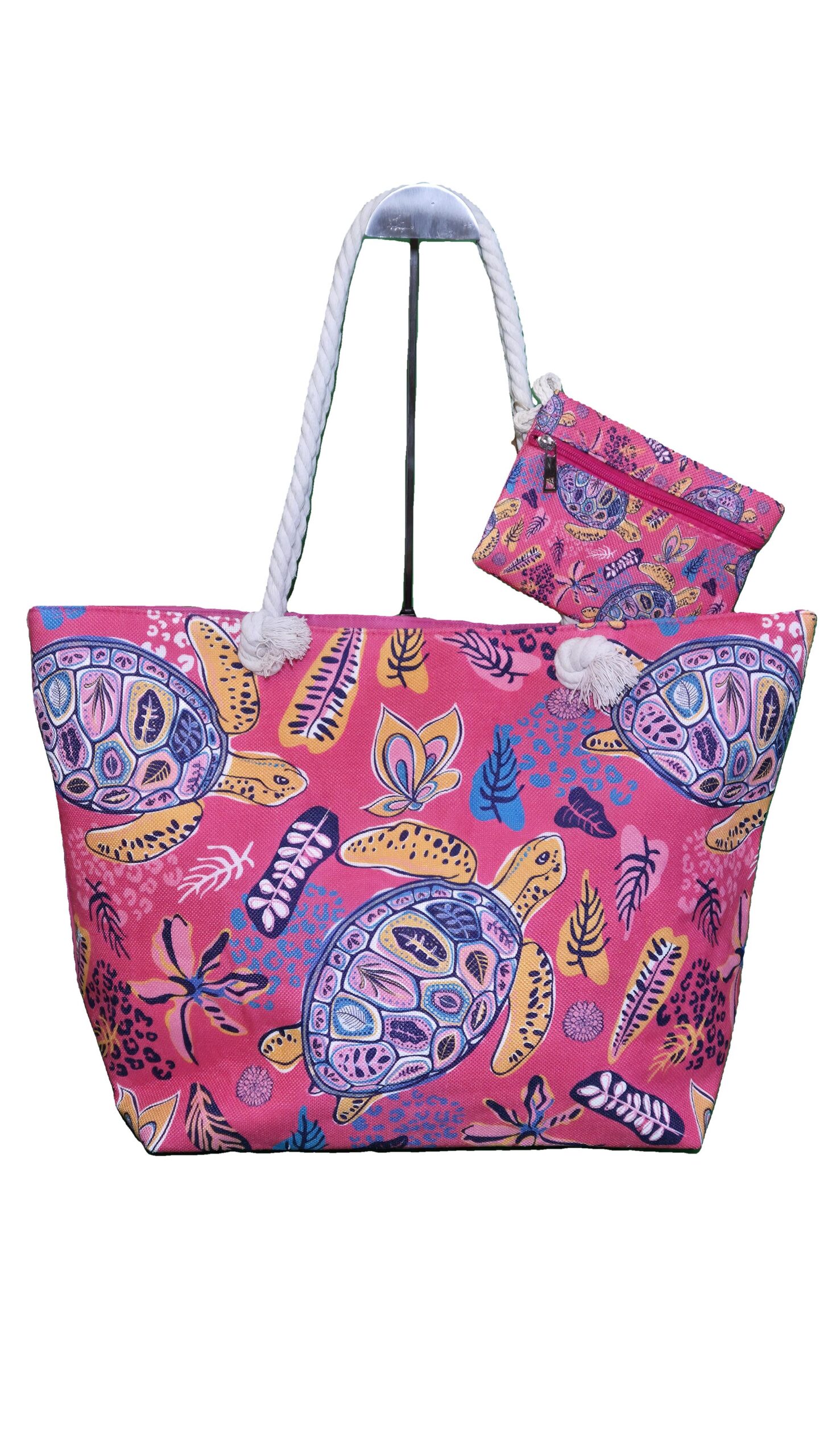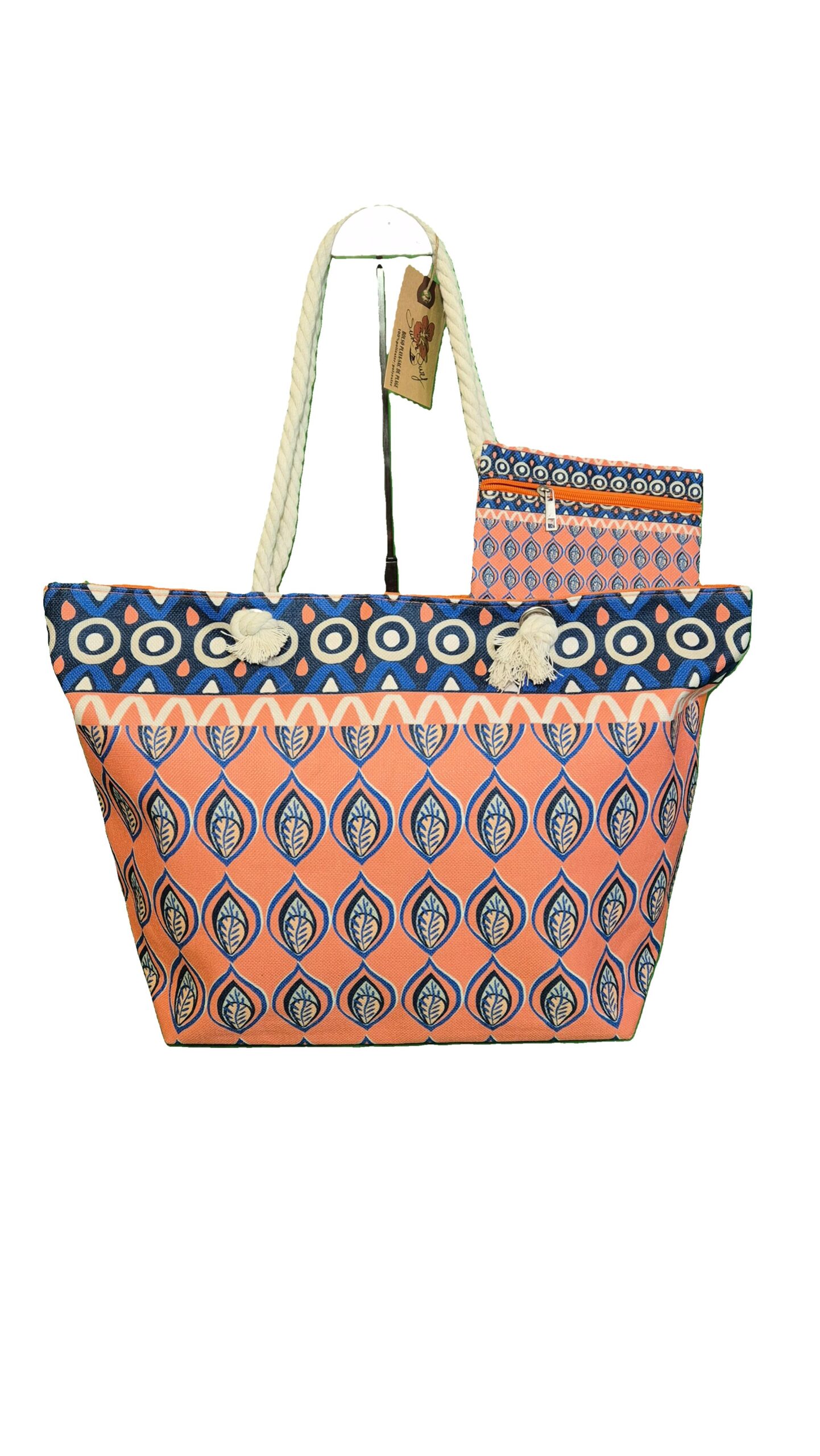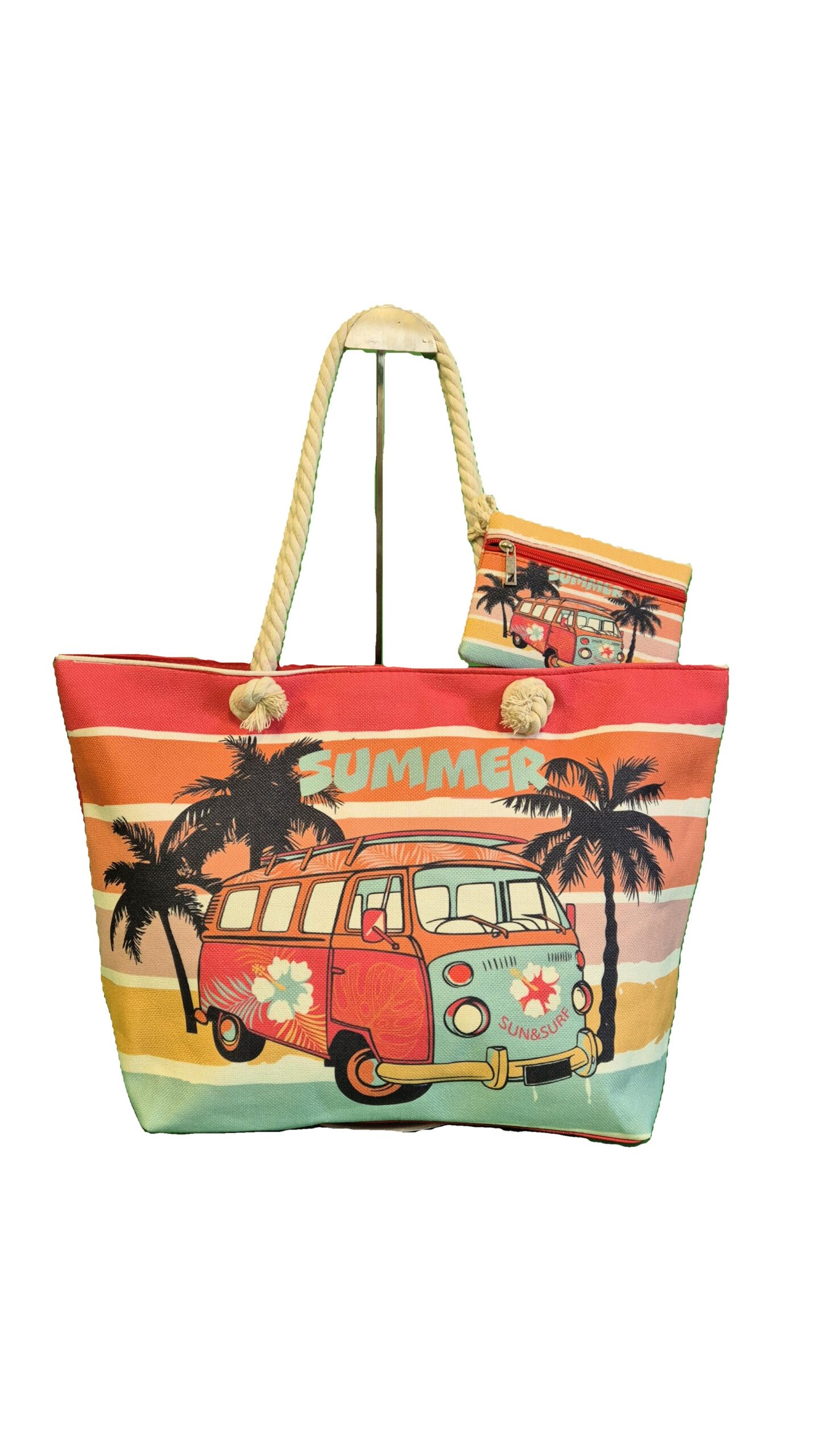 Un sac de plage avec son porte-monnaie assorti.